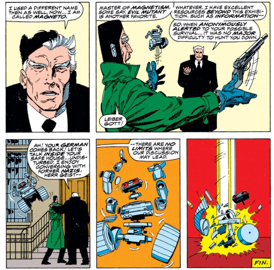 Le dice «¡al diablo contigo, escoria nazi!» y le arrea. Básicamente porque Cráneo Rojo le hace una falsa equivalencia poniéndole encima de la mesa los millones de victimas civiles de la Segunda Guerra Mundial contra la tripulación que le tiró encima un misil nuclear y que marcó la línea roja que puso el punto final de Magneto como supervillano.