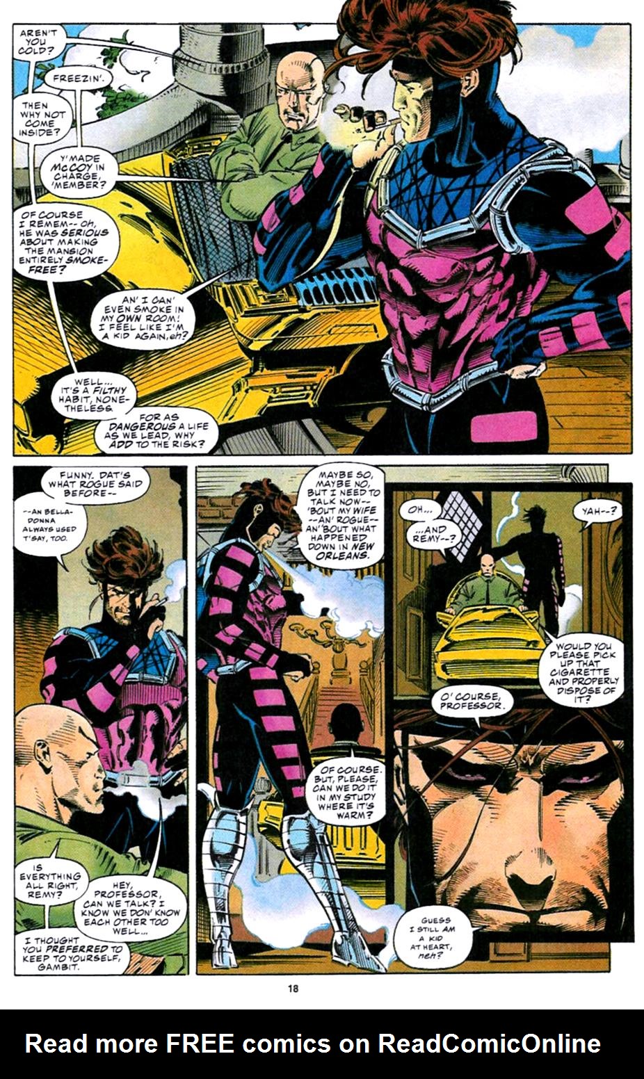 Yo recuerdo esa escena escrita por Nicieza, en X-Men a secas, en que el profesor X le pregunta a Gambito por qué fuma si ya tiene una vida muy peligrosa, lo que no recuerdo es la respuesta de Gambito, un me la pela o algo así me imagino.