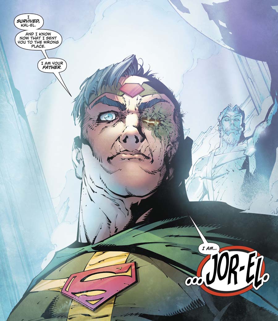 Y aunque ahora mismo no recuerdo (ni localizo) historias anteriores en las que encontrásemos a un Jor-El poco heroico, y dudo que en la DC pre-Crisis existan más historias en esa línea, sí que hay una versión posterior, y algo polémica, en la que Jor-El es más cabrón que nunca. Entre Geoff Johns, Dan Jurgens y Brian Bendis contaron a lo largo de varios años, comenzando en 2014, que Jor-El había sobrevivido a la destrucción de Krypton, siendo salvado en el último instante por el Doctor Manhattan de Watchmen (no es coña) quien le convirtió en el villano Mr. Oz, mostrándole lo peor de la humanidad para convencerle de que esta no merecía ser salvada.