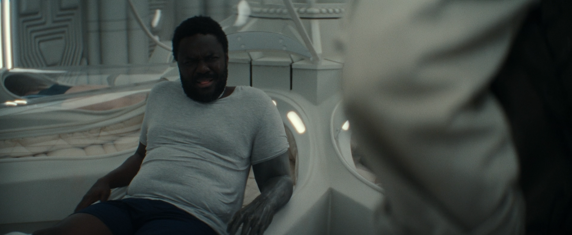 Precisamente fueron las prisas de Zaveri lo que salvó al segundo infectado, el oficial científico Bronski -su amante, como bien le avisa el rijoso de Clem al que le gusta espiar a los demás mientras se dan cariño- al que, con Morrow ya presente imponiendo la voluntad de la corporación, deciden seguir el protocolo de la Weyland-Yutani y congelarlo hasta llegar a la Tierra. Se nota que Morrow está bastante enfadado porque no se han cumplido los protocolos y Zaveri, consciente de que la ha liado parda, actúa como si le importara más el hecho de que Morrow va en calzoncillos -está recién deshibernado y es una emergencia- que toda la que se ha liado. Escenas como esta no dejan de provocarme la ocurrencia de operar a los infectados boca abajo, porque si lo hacen con cierto cuidado y con algún tipo de superficie debajo con cierta resistencia al ácido (que no tengo ni idea de si en este caso la tienen) probablemente habrían podido sacarle el bicho. Por no hablar de que oye, si el chupacaras no mata y solo te mantiene vivo, lo que tienen que hacer es sacarles el renacuajo del xenomorfo, pero éso último esta gente no lo sabe. El caso es que Morrow está bastante enfadado porque no se han cumplido los protocolos y Zaveri, consciente de que la ha liado parda, actúa como si le importara más el hecho de que Morrow va en calzoncillos -está recién deshibernado, vaya- que toda la que se ha liado. Cuando le explican que hubo un incendio en la nave y Dinsdale y Bronski fueron los primeros en ir a apagarlo y por éso han acabado así «porque había dos jaulas del artrópodo que se abrieron», Morrow ya pone cara de sabotaje, pero Zaveri no le deja seguir investigando porque primero necesitan decidir que hacer con los dos infectados; huele más a que ella no quiere decir ciertas cosas delante de tanta gente y quiere hablarlo con él en privado. Al salir de la enfermería, el ingeniero Shmuel avisa a Morrow de que el incendio ha tostado el sistema de navegación y velocidad de la nave hasta el punto de que ya no es una nave, es un misil.