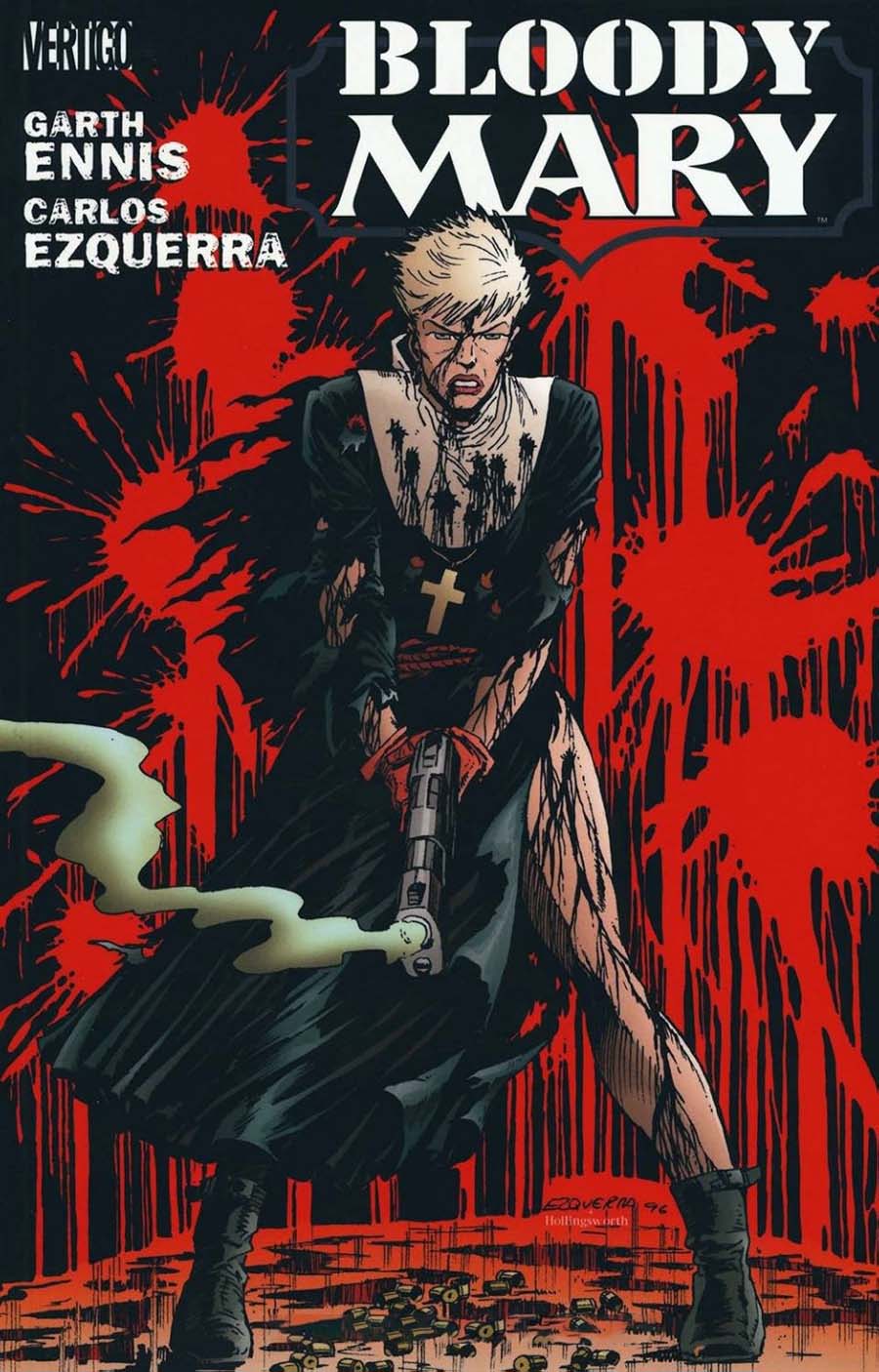 Bloody Mary nació en 1996 como parte de la breve línea editorial Helix de DC Comics, sello bajo el cual se publicaban aquellas series propiedad de sus autores que no encajaban con la temática de Vertigo o de otros de los sellos editoriales de la casa como Paradox Press. Una línea que apenas duró dos años y de la cual creo que solo se recuerdan esta Bloody Mary y la mucho más popular Transmetropolitan, que continuó publicándose en Vertigo tras el cierre de Helix en 1998. Pero pese a la breve existencia de ese sello editorial, Ennis y Ezquerra consiguieron publicar dos miniseries de cuatro números, Bloody Mary y Bloody Mary: Lady Liberty, que fueron recopiladas en tomo tanto por parte de DC Comics como en Image años más tarde, y pese a los años transcurridos sigue siendo una lectura muy divertida y sorprendentemente actual.