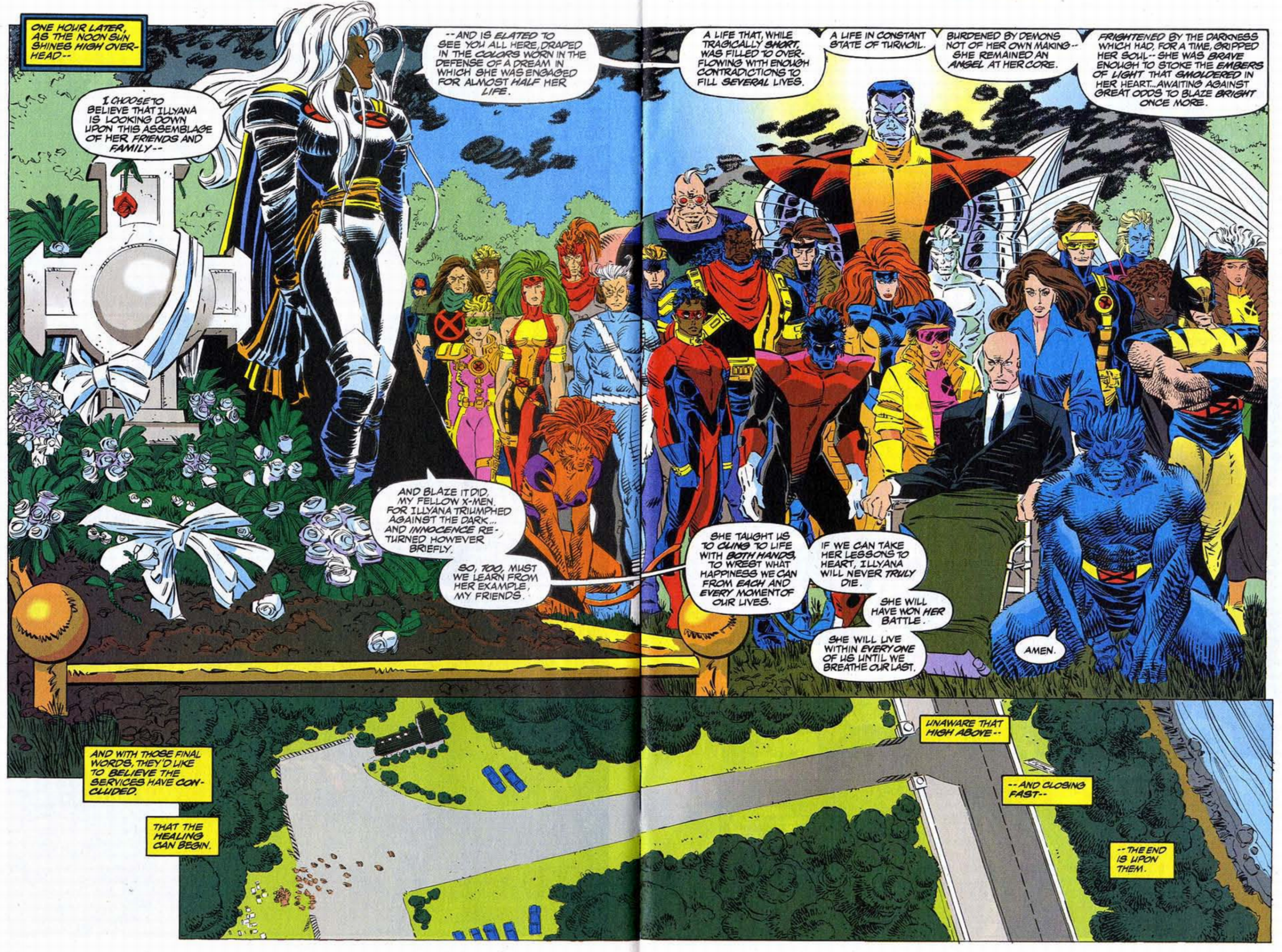 Yo casi que me alegro que se cargaran a Illyana, así no tuvo que ser transformada y desdibujada en los terribles 90. Que volviera cuando la burbuja y sus terribles guionistas y dibujantes se piraron. Lo cual no quita que destruyeron todo lo bueno que había ( entre ello la pequeña illy).